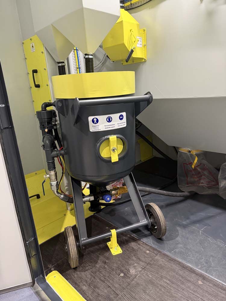 Large side access doors allow straightforward loading of components. The installation includes the blast pot, hopper, and PLC control system. Each element was built and integrated by our team to ensure reliable operation and simple control for the operator.