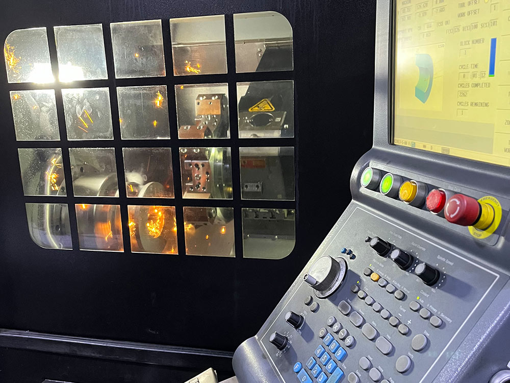 Making lots of sparks on the CNC lathe when we final machine our hardened blast wheels.