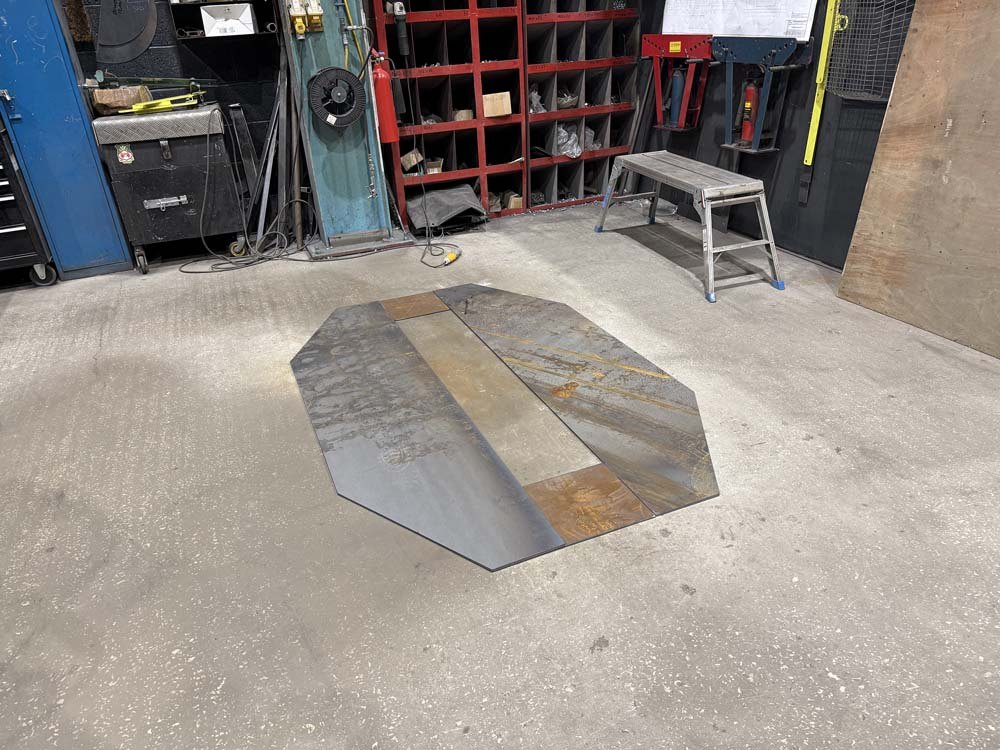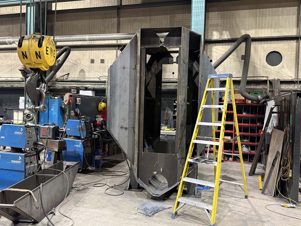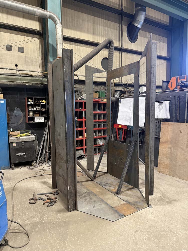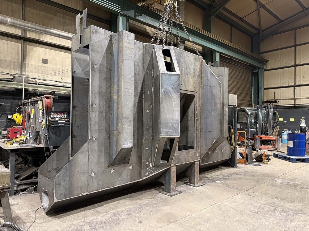 Fabrication is well underway. Plasma cut sections have been prepared and the first plates assembled. The main body is now taking shape as structural panels and internal sections are positioned and secured.